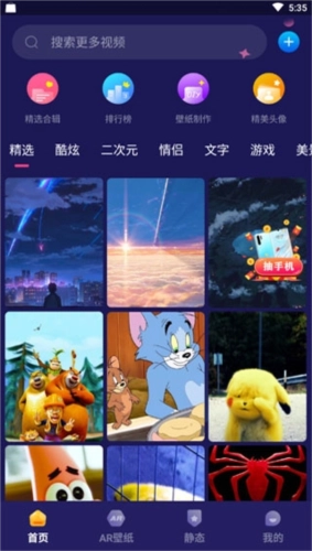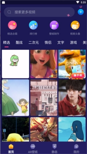 1. 当您进入首页时,能够看到动态壁纸、图片壁纸以及精美头像这几个分类。其中,动态壁纸内设有精选、横屏、明星、唯美等标签,同时还具备QQ和微信皮肤、精选合辑以及排行榜等功能区域。