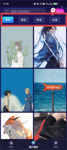 2、图片壁纸界面顶部排列着最新、精选、物语、动漫分类标签,下方展示着各种风格的壁纸,每一张都很精美能轻松找到适配自己审美、用来美化手机桌面的心仪壁纸。