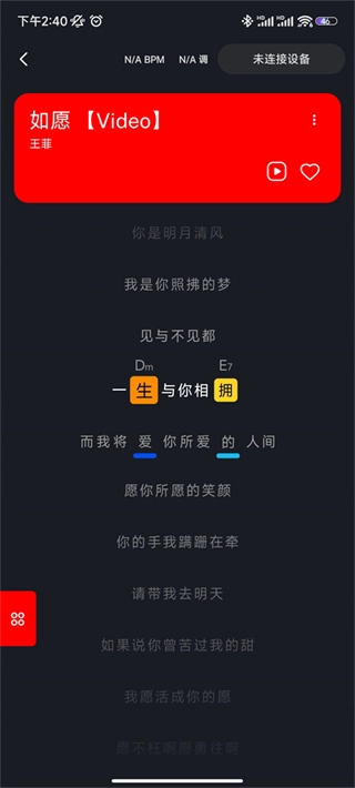8、在演奏中途也能够开启鼓机,此时鼓机的预备拍变为两拍,因此我们得提前两拍开启鼓机。举例来说,当我们弹唱《如愿》,在副歌前唱到“一生与你相拥”,到达这个3级和弦的位置,就需要打开鼓机。