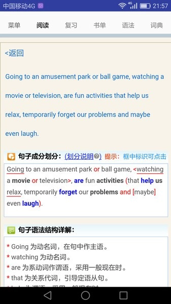 4、语法与学习要点:句解霸可识别句子里的相关语法点及学习点,同时给出这些语法点和学习点的解释。