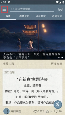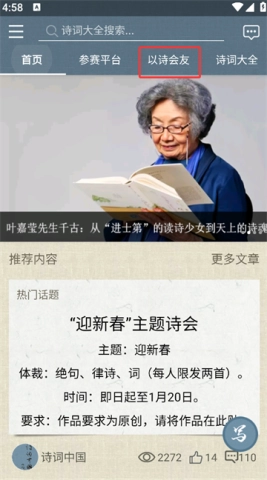 1、首先进入应用首页,点击“以诗会友”。