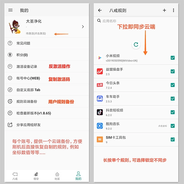 2、默认设置,规则列表界面向下拉动,即可同步云端,长按单个规则可选择锁定不同步。