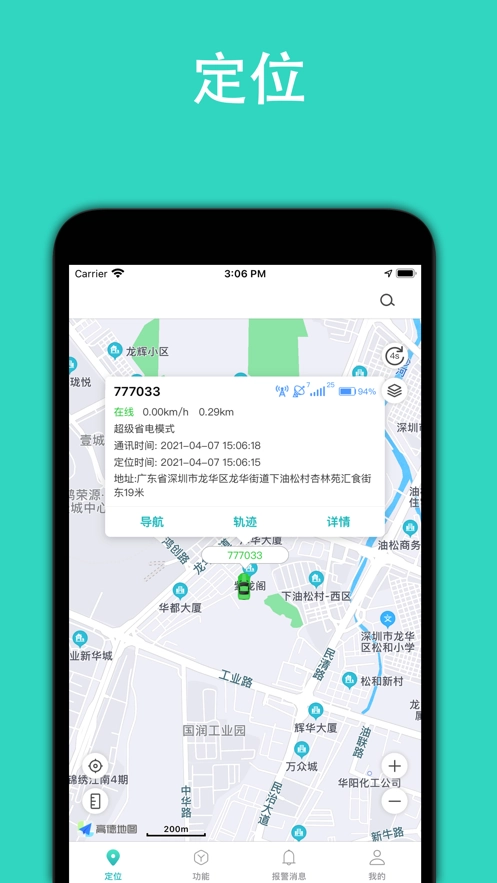 实时定位:用户在这里可以在地图上面查看车辆的实时位置,并且可以查看车辆的定位信息