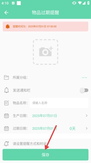 3、完成信息填写后,点击【保存】按钮,就能创建新的临期提醒,避免物品过期。