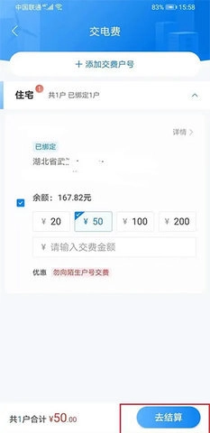 在选择好服务项目后,接下来需要选择电费的缴纳金额,然后点击“去结算”按钮。