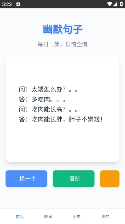 1. 幽默句子软件免费版,就是您随时随地能携带的快乐宝藏!轻点“换一个”按钮,就能开启全新笑话篇章,还有拷贝功能,让您即刻分享给亲朋好友。