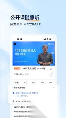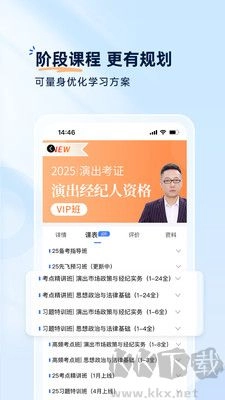 1、演出经纪人证书,是演艺及演员行业不可或缺的资质证明,每年仅安排一次考试,时间在5月底至6月初。2025年VIP班的视频课程涵盖7种班型,具体为6个录播班次搭配1个冲刺直播课。课程专注于梳理重难点,临近考试时进行考点押题,全力助力考生在考前提分。目前,演出经纪人新大纲题库已全面更新完毕,涉及演出市场政策与经纪实务、思想政治与法律基础这两个科目。