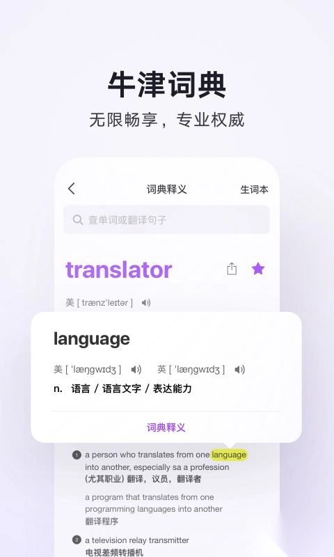 腾讯翻译君,通常也被叫做腾讯翻译官。秉持极简匠心理念,完全免费且。它支持英、日、韩、西、俄、法、德、泰、越、印尼、马来、意、葡、土等众多热门语言的翻译,还具备语音翻译、同声传译、文本翻译、实景AR翻译、口语评测等一系列功能。同时,该应用支持使用全球权威的《新牛津词典英汉双解大词典》,能够充分满足翻译学习、口语练习、出国旅游、日常交流等各类需求。