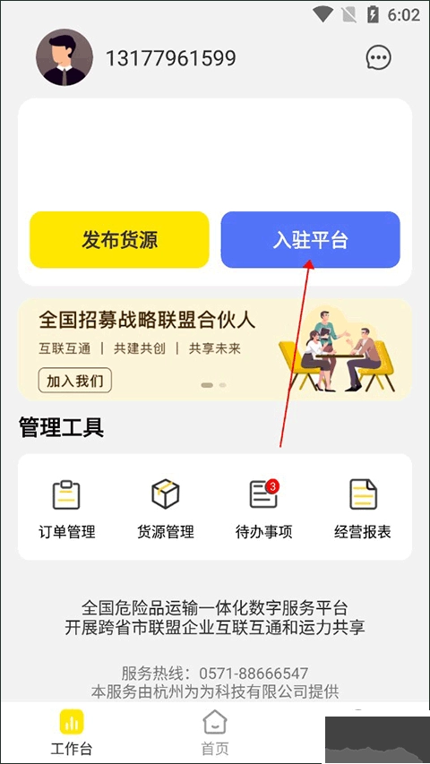 1、第一步,点击进入危司机界面。于该界面内,寻找到主页所在之处,接着点击主页上的“入驻平台”选项。