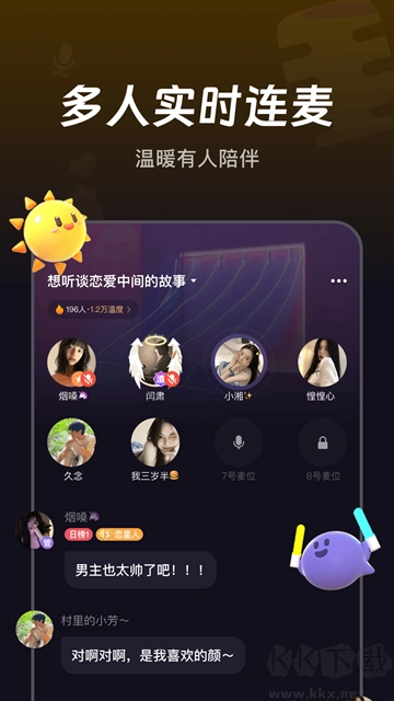 1.多种主题房间自由加入,语音连麦和文字聊天,遇到兴趣相投的人可直接关注;