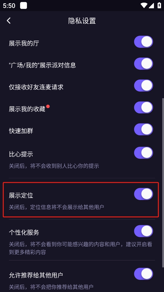 5. 向下滑动页面,找到展示定位选项,将其开关关闭就可以了。