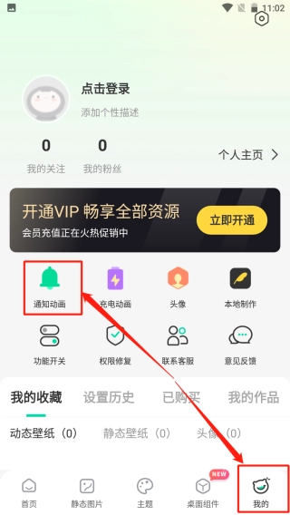 1. 打开主页,轻点“我的”选项,接着点击“通知动画”。