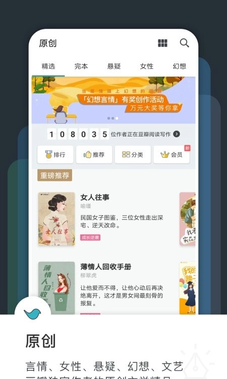 全部原创内容,每月推出9000+全新作品,其中超半数作品读者可免费阅读。这些佳作皆出自当下最杰出的青年创作者之手。