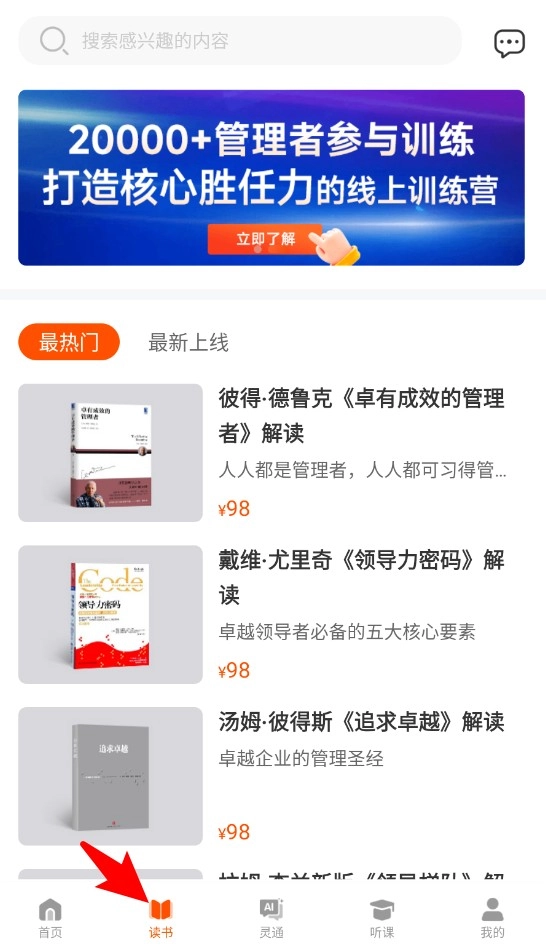 2. 读书板块设有热门管理书籍的内容导读,轻点书名即可跳转至详细内容页面。