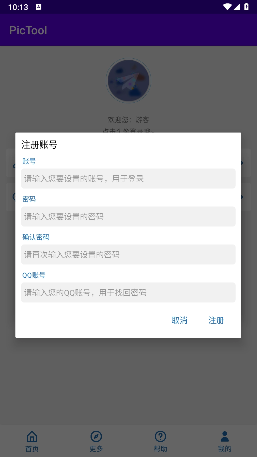 5.在注册页面,输入账号、设置密码、填写QQ账号,点击【注册】
