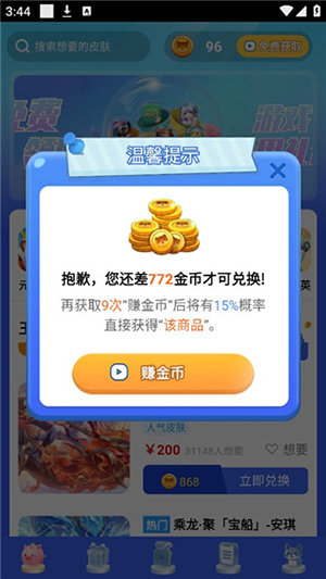 3、最后点击“立即兑换”,利用赚取的金币,就能成功兑换到心仪的皮肤。