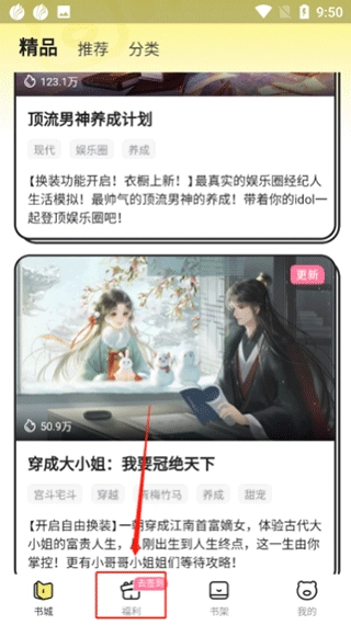 用户点击左下角书楼,即可进入书楼页面,页面有很多小说供你选择,可以选择精品、推荐、分类小说进行沉浸式阅读。