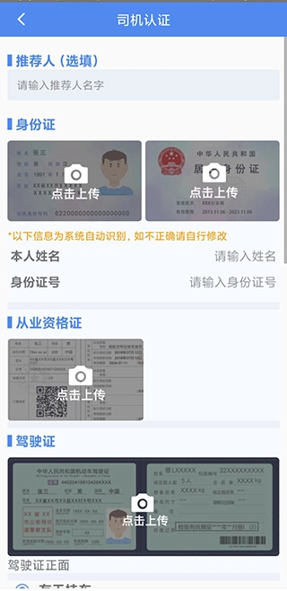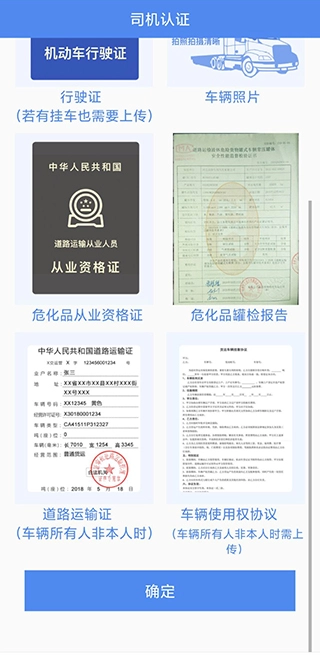 2、下一步,需要司机认证,需要准备以下材料:身份证、驾驶证、行驶证、车辆照片、危化品从业资格证、危化品罐检报告、道路运输证、车辆使用权协议,然后点击确定;