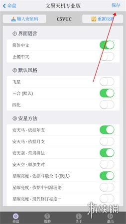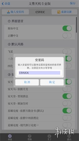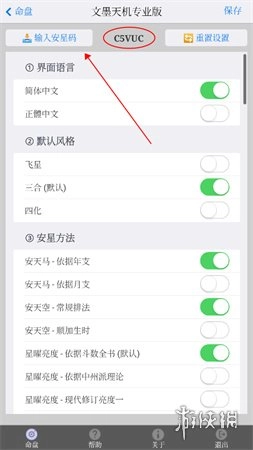 2、进入设置界面后,找到并点击“输入安星码”选项。此时界面中间会出现一个红圈,红圈里显示的就是安星码。您可以输入其他已预设好的安星码,这样就能生成和预设一致的排盘了。
