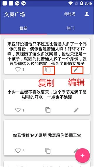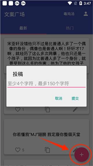 4、下方的加号选项,用户可以进行文案投稿,把你喜欢的文案或者心中自创的美句发表出来让大家欣赏。
