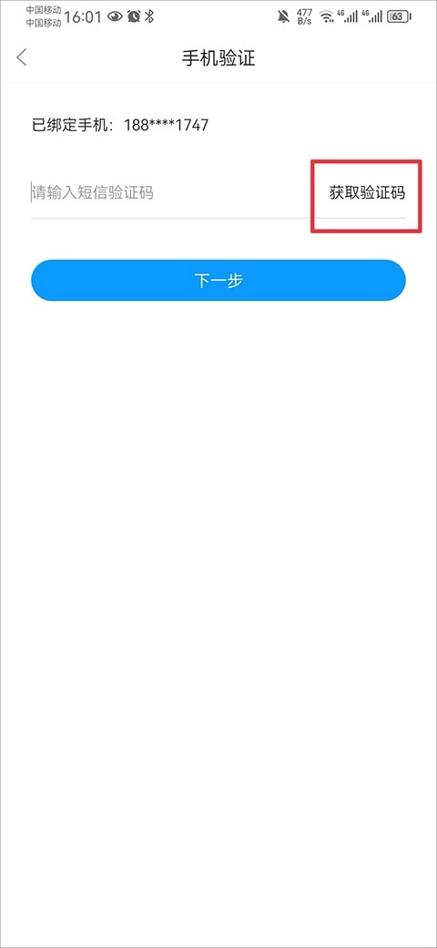 4、进入手机验证界面后,点击“获取验证码”的按钮,待收到验证码并将其输入完成后,再点击“下一步”按钮。