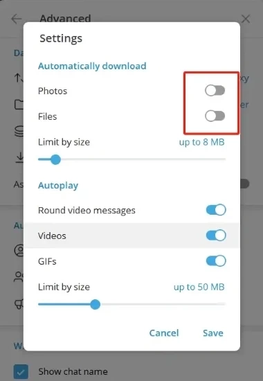 你可以分别点击下方的私人聊天、讨论组和频道选项,将文件与照片的自动功能关闭;或者设定一个文件大小阈值,仅允许低于该MB数值的文件自动传输;此外还能配置GIF、视频等内容是否自动播放。若要实现完全禁止自动的效果,则需把所有相关开关都关闭。