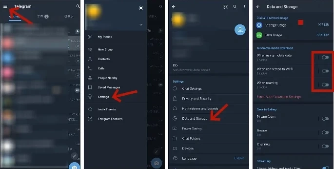 点击左上角的三条横线图标,进入设置页面,接着找到“数据与存储”选项,最后关闭“自动媒体下载”下方的三个选项即可。