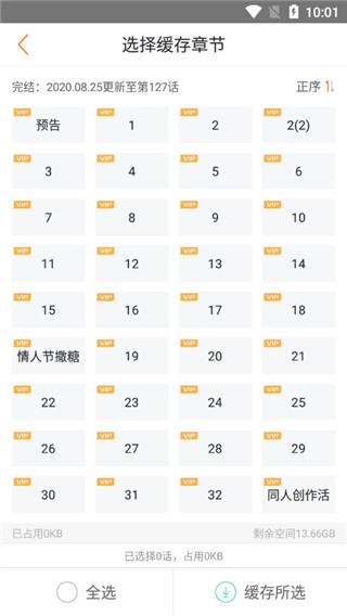3、挑选需要缓存的章节,点击右下角的“所选”按钮,就能完成漫画缓存,进而实现离线阅读。
