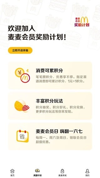 切换到【奖励计划】页面后,我们还可以加入麦麦会员奖励计划,消费时能累积积分兑换超值好礼。