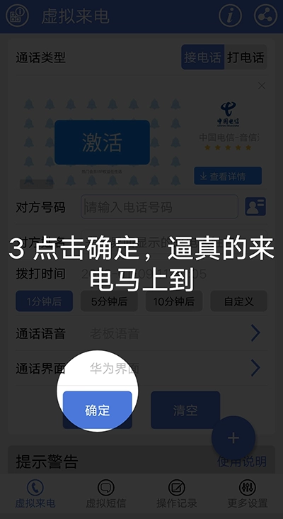 使用提示:本功能仅为虚拟来电模拟,不会实际发起通话,也不会产生任何通信费用,您可安心使用。