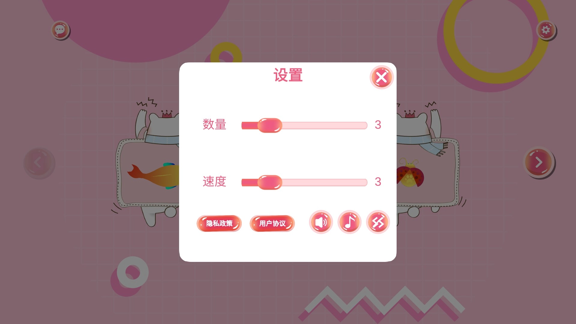 2、点击设置,选择逗猫玩具显示的数量、运行速度,是否播放猫游戏的触碰声音、背景音乐、振动效果;