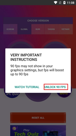 1、 若要在运行 Android 11 以下版本的设备上解锁 90 FPS,只需允许权限并点击解锁 90 fps 按钮即可。