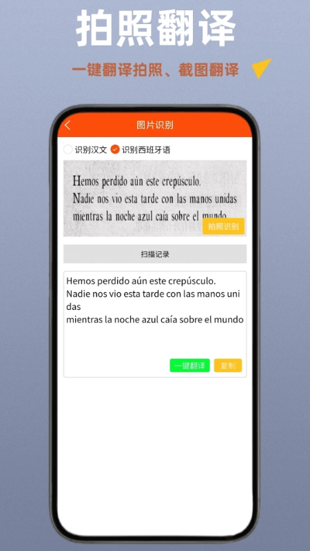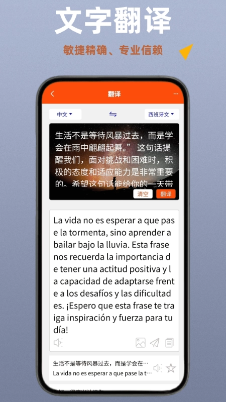 西班牙语翻译通是一款能把中文转换成西班牙语的软件,具备文字翻译、语音翻译、拍照截图翻译等多种功能。翻译结果还能实时语音播放,方便大家轻松练习正确发音,保证西班牙语表达精准无误,是你学习语言时不可或缺的得力工具,快来试试吧!