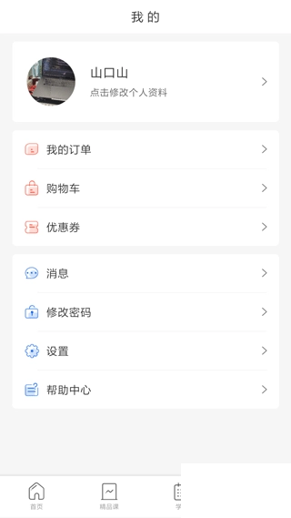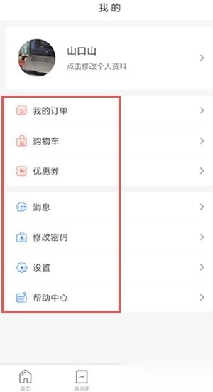 5、在“我的”栏目中,您可以进行订单管理、购物车管理、优惠券管理,还能修改账户密码等个人设置。