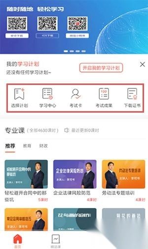 2、在首页,可以找到学习计划、学习中心、考试卡、成绩查询、证书等功能入口。