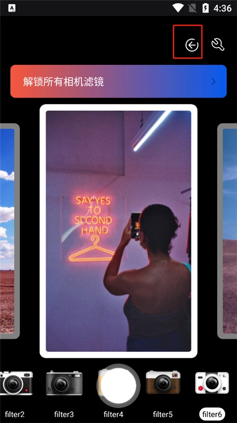 1、打开软件后,你会发现这里有大量的胶卷滤镜可供选择,只要挑选出你心仪的那一款,再点击中间的拍照按钮就可以了。