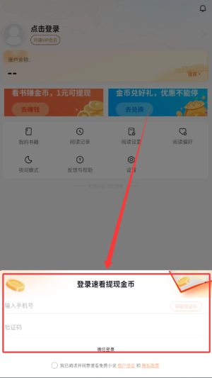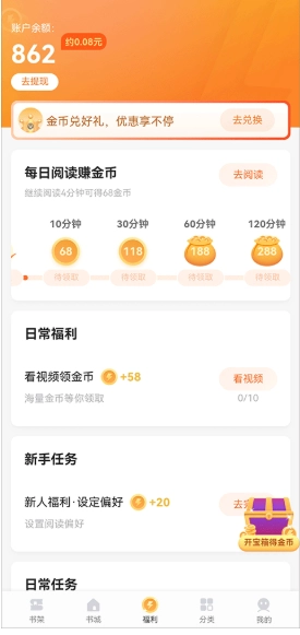 4、此外,在福利界面阅读书籍能够获取金币,当金币累计到一元对应的金额时,就可以进行提现操作了。