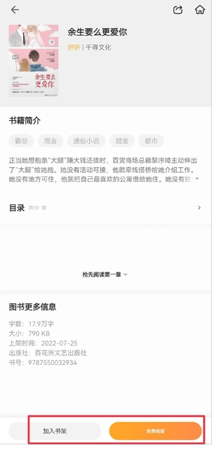 2、进入书籍详情页面后,你可以直接点击免费阅读按钮,也可以选择将其加入书架。