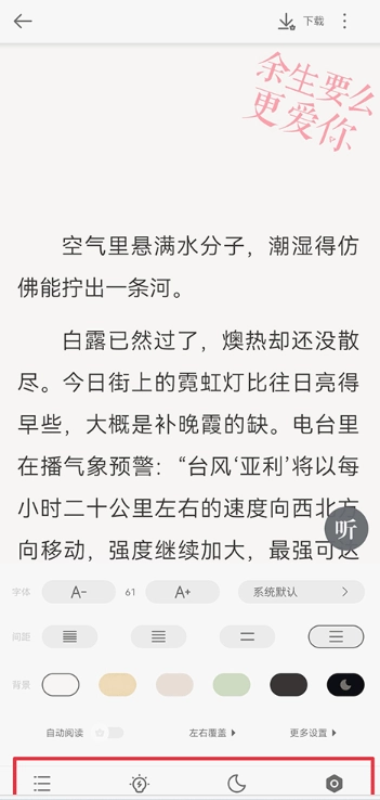 3、这样就能正常阅读内容了,点击屏幕还能调出菜单,你可以查看目录、调整亮度、切换日/夜间模式、设置自动阅读、调整字体等