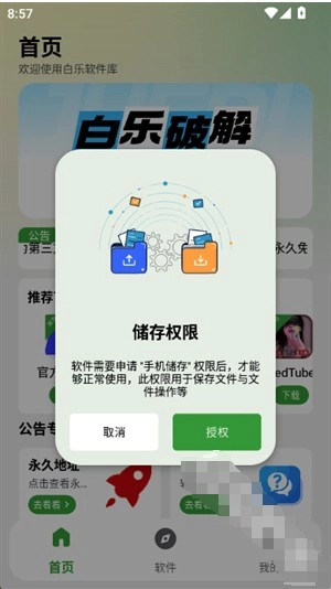 1.打开白乐软件库App,首先需要开启相关的权限