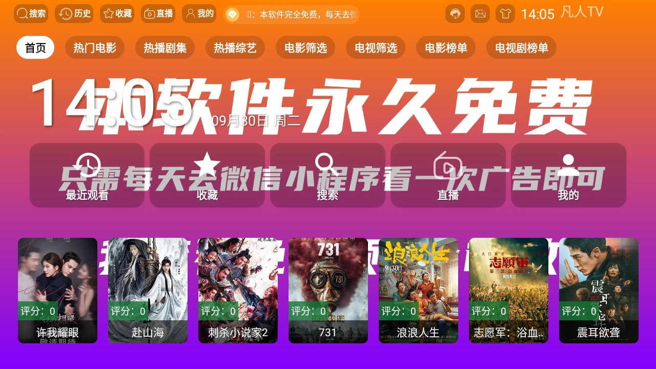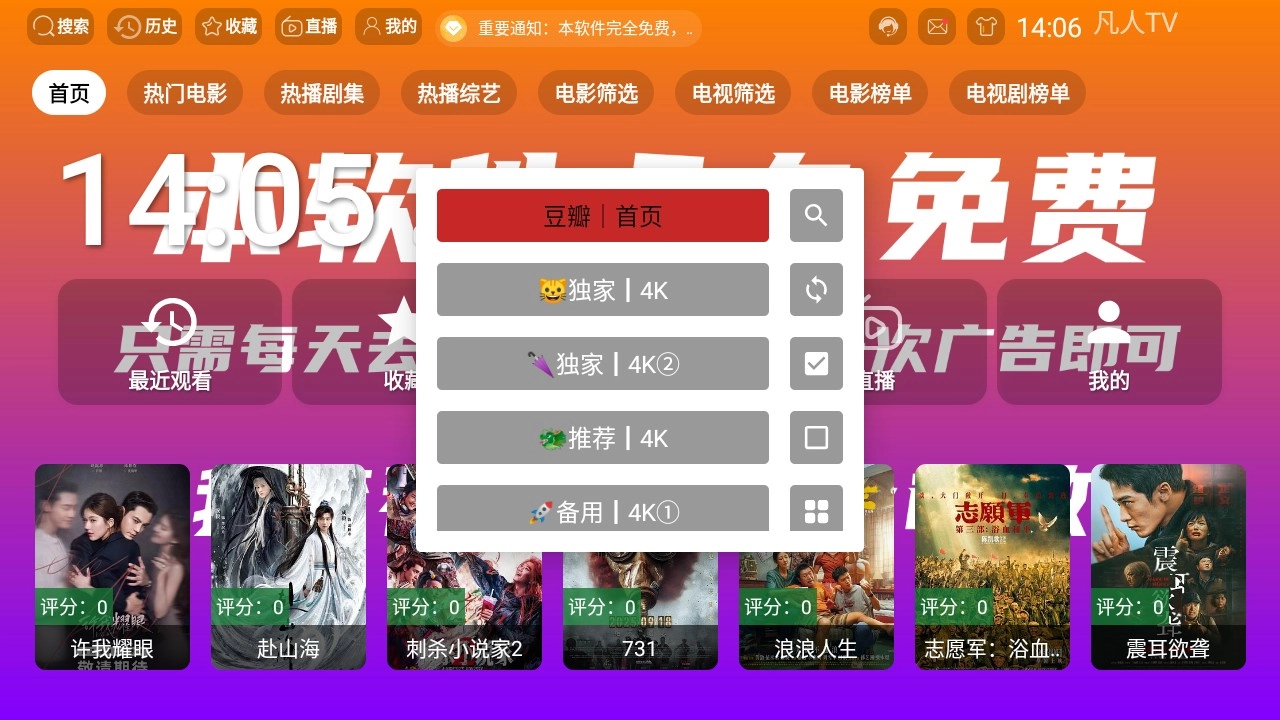 1. 打开凡人TV应用后,点击首页按钮,就能看到各类影视资源