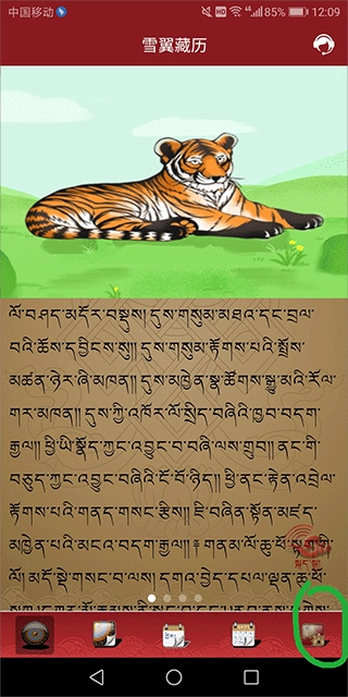 主要展示某一天的藏历相关信息,包括星期、星座、五行、吉凶等内容,点击右侧的“海螺”按钮就能进行语音播放。