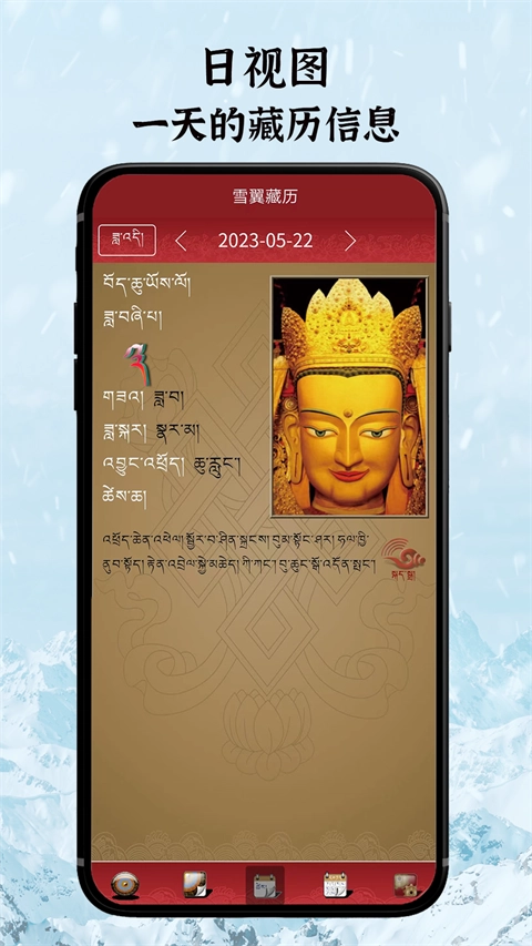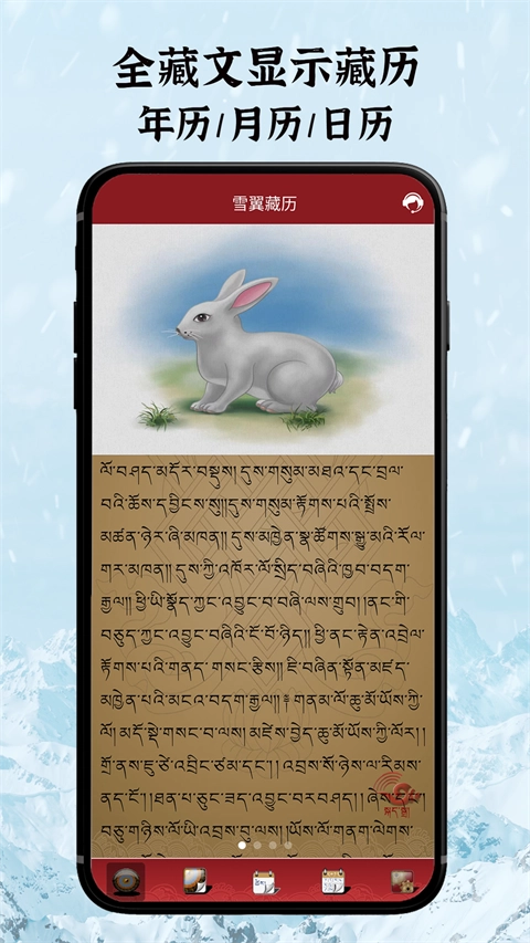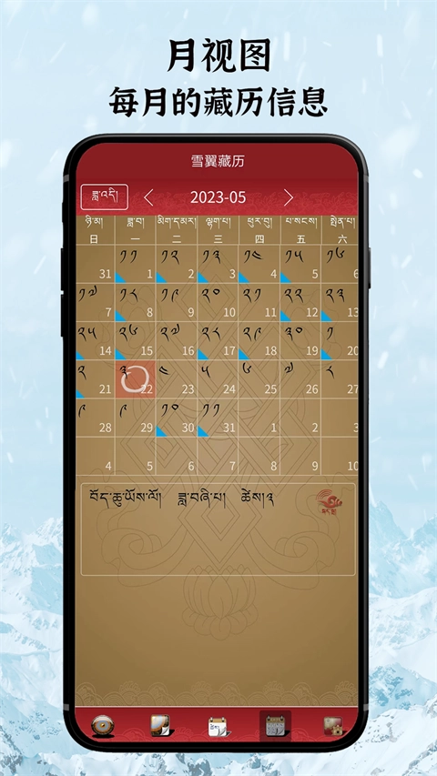 雪翼藏历语音是由西藏大学藏文信息技术研究中心、西藏藏医学院与西藏电信公司联合研发的藏族专属日历软件。它采用经典全藏文界面呈现电子日历功能,完整涵盖藏历核心信息,内容丰富多元:不仅包含年历、月历的详细解读,还能清晰查看每日、每月的藏历详情,同时实现公历、汉历农历的精准对应,甚至可延伸查询与公历相关的星座、五行等附加信息。
