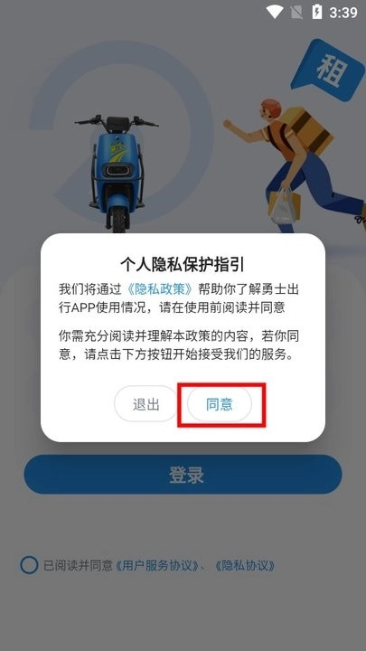 在本站安卓网打开勇士出行应用,仔细阅读弹出的个人隐私保护指引内容后,点击页面上的【同意】按钮。