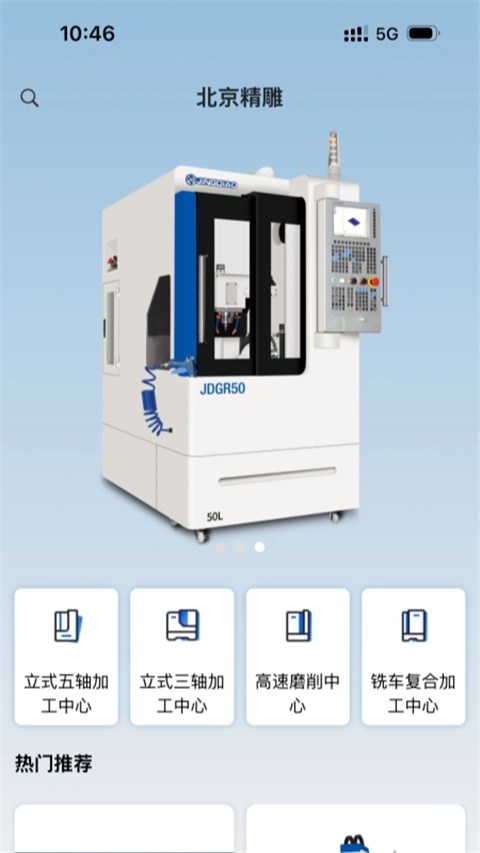 提供了精雕产品的分类入口、产品列表、热门推荐等,例如:五轴高速加工中心、三轴高速加工中心。
